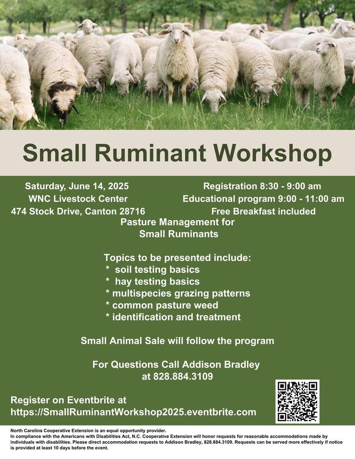 Are you interested in learning more about small ruminants? Join us for the Small Ruminant Conference that will be held in conjunction with the June Small Animal Sale at the WNC Regional Livestock Center on June 14, 2025.